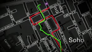 I met my new flatmate today, his name is Sherlock Holmes. He's kind of arrogant and long story short, we ended up chasing a taxi that contained who we believed to be a serial murderer. Even though we knew the taxi was going at about 6.7056 m/s, we were able to catch up to it when we were running at about 2.682 m/s. I'm not sure how much less distance we traveled in order to have caught up to that taxi, but I know that it took both of us about 95.2 seconds to reach the same point. Above is a map of the path of the taxi (red) and the path that Sherlock and I took to catch it (green).